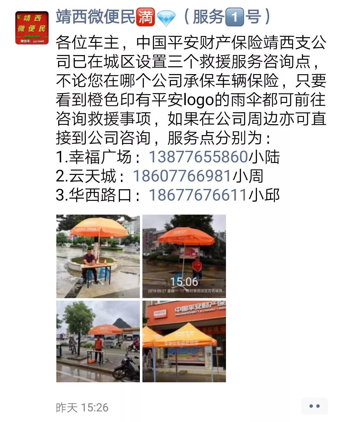 5月27日凌晨,百色靖西县同样遭到特大暴雨侵袭,全城发生水淹、断电情况,平安立即组织合作救援商,分别在三个地段设置救援服务咨询点,并委托当地最大的自媒体“靖西微便民”进行全城发布,无论是哪个公司承保的车险客户,均可到服务咨询点进行咨询。醒目的平安橙大雨棚,是平安最坚定的守护。