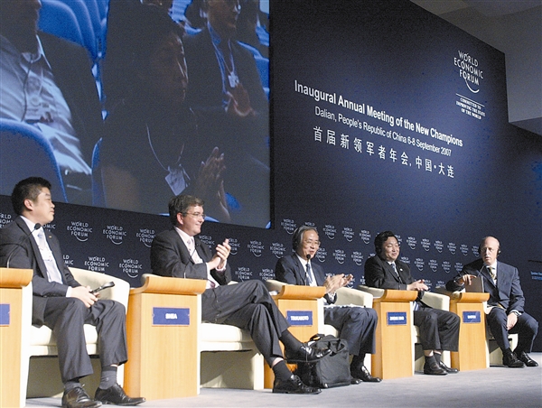 2007年,夏季达沃斯新领军者年会上,北京华旗资讯科技发展有限公司、中国全球青年领袖冯军(左一)提出:“保护知识产权更需要媒体的鼓励、中国目前的知识产权保护环境越来越好!”赢得嘉宾和全场听众的热烈掌声。杨国胜 摄