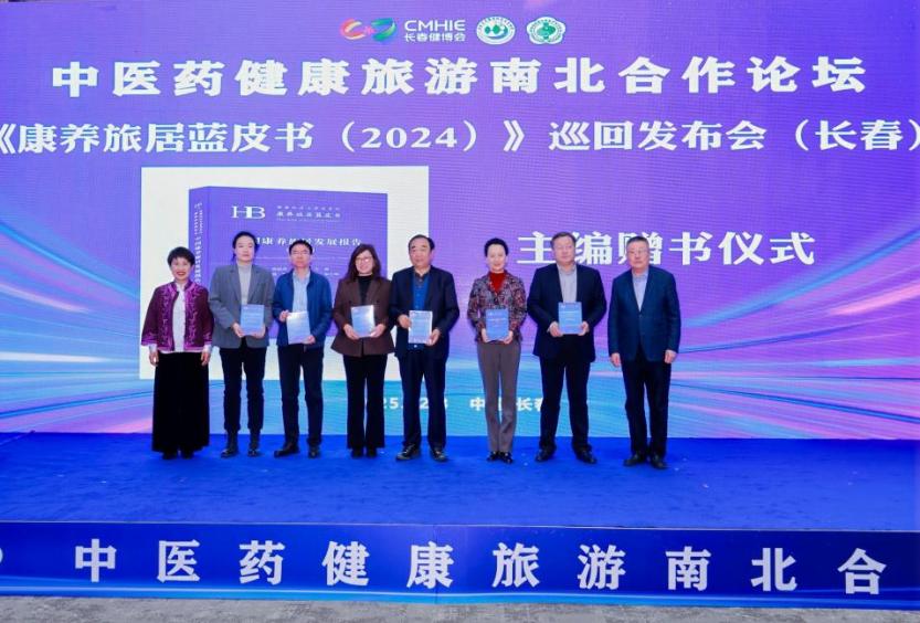 在《康养旅居蓝皮书(2024)》巡回发布会(长春站)中,北京中医药大学国家中医药发展与战略研究院健康产业研究中心主任侯胜田致发布辞,呈现了一份兼具理论高度与实践价值的行业指南。现场还举行了赠书仪式,侯胜田教授分别向吉林省科学技术协会秘书长方艳红,延边州民政局局长许海兰,抚松县副县长李飞武,吉林省中医药健康产业协会会长张益胜、副会长金立华,海南博鳌乐城国际医疗旅游先行区管理局医疗旅游部副部长张延宁赠送《康养旅居蓝皮书(2024)》。