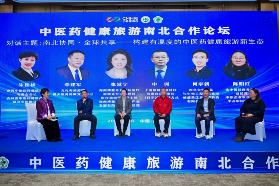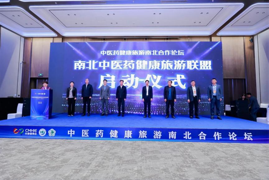 当振奋人心的音乐响起,长春市文广旅局局长张辉勇,长春市文旅发展集团有限公司董事长董红涛,长春市贸促会副会长张书野,吉林省中医药健康产业协会会长、吉林省集安益盛药业股份有限公司董事长张益胜,海南博鳌乐城国际医疗旅游先行区管理局医疗旅游部部长闫路恺,吉林省民营中医医疗机构协会会长、长春单氏中医院、长春单氏肝胆病医院院长单晓春,海南省中医药学会膏方专委会主委、广东省中医院海南医院治未病中心主任程亚伟,中国国际商会吉林商会执行主席单位、吉林云岭野山参科技开发有限公司中国区运营总裁米军辉8位嘉宾走上台前,共同启动“南北中医药健康旅游联盟”,标志着南北区域在中医药健康旅游领域的合作进入机制化、平台化新阶段。
