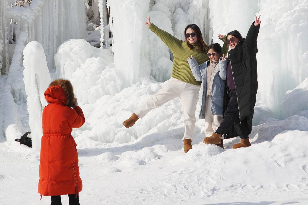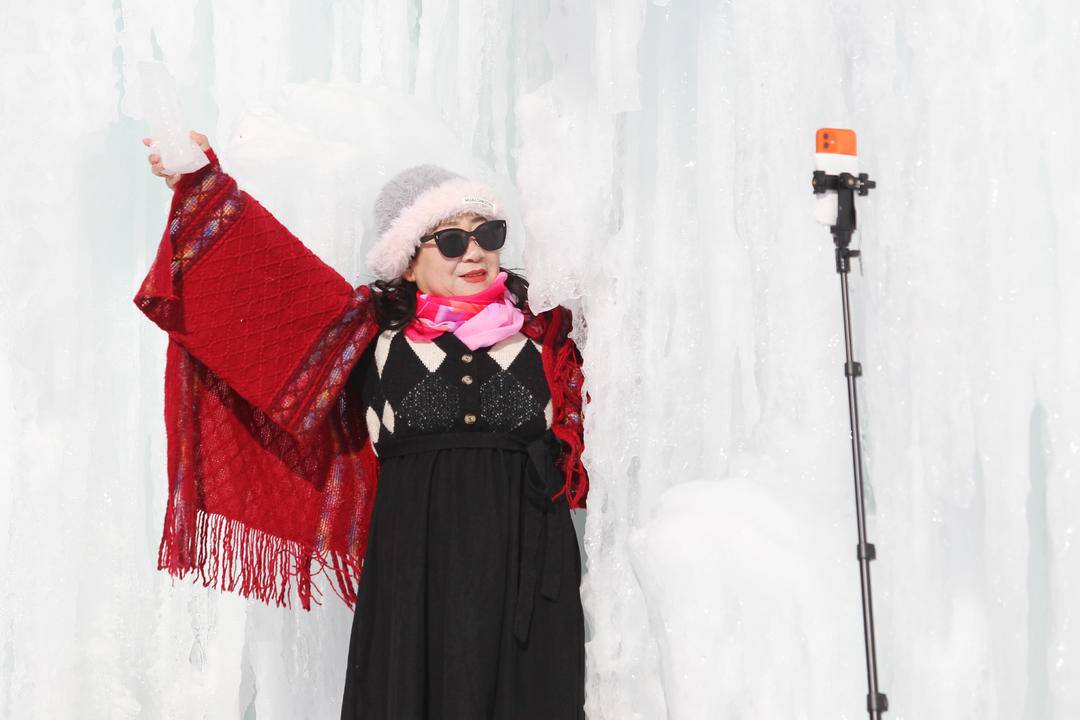 近日,沈阳市浑南区双园路的冰瀑布引众多游客前来打卡拍照。这里的冰瀑布造型独特,在蓝天的映衬下,显得格外壮美,游客们身着各色冬装,在此摆出各种姿势拍照,轻松就能拍出冰岛同款美照,随手一拍就是大片,能让游客轻松拿捏冬日氛围感。(本组图片由记者 白琳 摄)