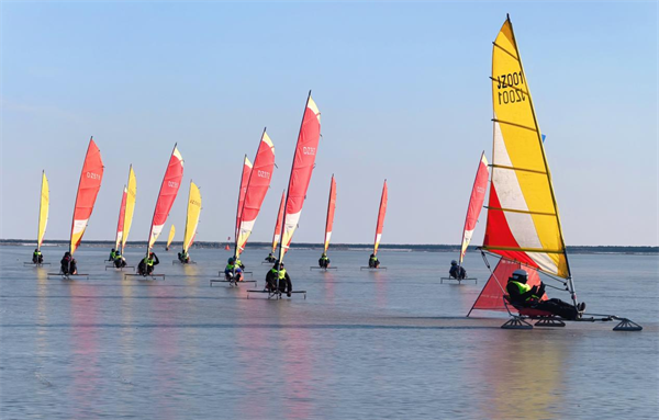 本次活动的核心优势载体——锦州金沙滩海上冰场,这片天然形成的海上冰场拥有无可替代的运动优势:与河湖淡水冰面相比,海冰硬度适中且平整度高,能让冰帆的冰刀实现完美贴合,有效减少航行横移,使船只时速最高可达风速的5倍以上,为高密度赛事顺利开展提供了坚实保障。