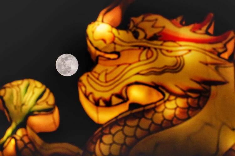 农历正月十六夜晚,一轮圆月现身沈阳天宇。(多重曝光照片)