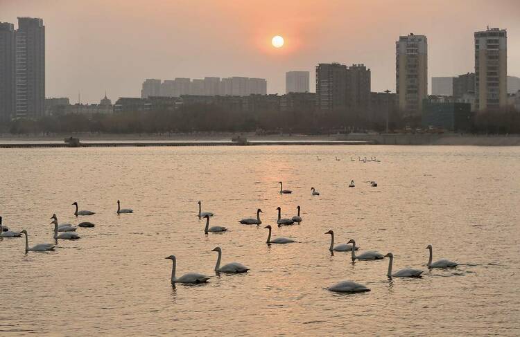 近些年,随着朝阳市大凌河城区段水质的改善,加之周围生态环境的改变,迁徙驻足的天鹅逐年增多,每年3月初这些充满灵性的天鹅在此歇息近一个月时间,市民在家门口就可看到成群的天鹅,给朝阳城区增添了一道靓丽景观。(摄影 仇一军)