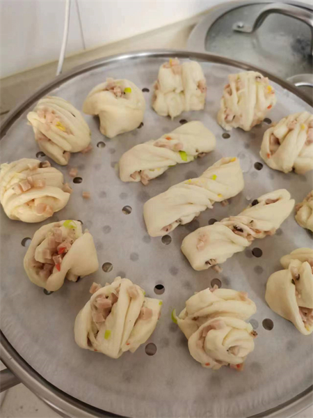 经过发酵的花卷制作完成放进蒸锅后,居民们计算好时间,并谨记老师讲解的要领,松软可口的花卷就出锅了。