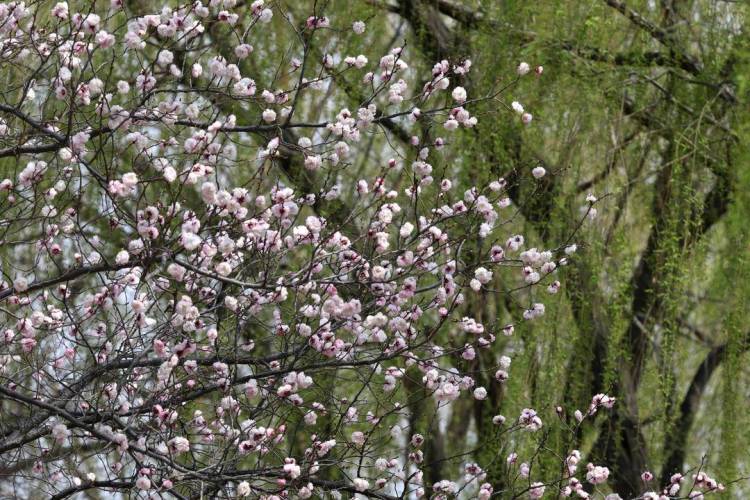 远远望去,河畔的辽梅杏林宛如一片粉色的云霞,微风拂过,花枝摇曳,招蜂引蝶,美不胜收。走近细看,每一朵辽梅杏花都姿态各异,或含苞待放,或尽情舒展,洁白中透着粉嫩的花瓣层层叠叠,簇拥着嫩黄的花蕊,散发着淡淡的清香。