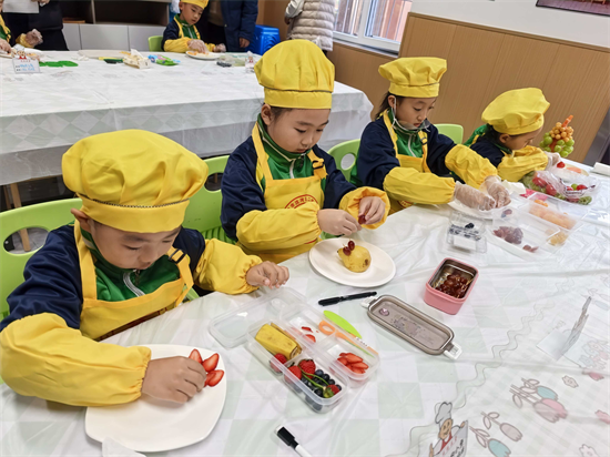 在现场展示环节,五年级学生在幸福厨房烹饪菜肴,切配、翻炒、调味一气呵成;二年级学生的水果拼盘创意十足,色彩搭配与造型设计巧思频现;三年级的捆书操作规范高效,充分展现了不同学段学生扎实的劳动技能。