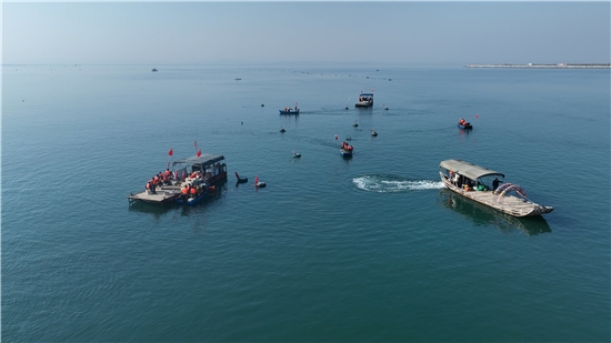 “出征!”平岛渔港里,随着一声嘹亮的口号,身着专业装备的“海碰子”们喝下壮行酒,驾船驶向蔚蓝的养殖海域。