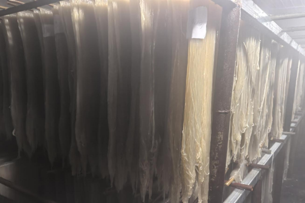 这股“热劲头”的背后,是生产模式的突破性升级。自2024年起,殿中粉条加工厂响应大谭街道“培育特色粉条产业,激活乡村经济活力”号召,聚焦传统工艺瓶颈发力,新建的4座冷库成为关键突破口。如今,冷库可精准调控温湿度,无论夏季30℃高温还是早春多变天气,都能提供稳定生产环境,日产能稳定在1万斤。“以前粉条加工全看天,温度得等12月末降到零下12℃,才能满足粉条定型、晾晒需求,一年近10个月都停工,产量和供应都不稳定。如今,冷库能够精准降温,实现提前一个多月开工,率先抢占市场。”工厂负责人介绍。