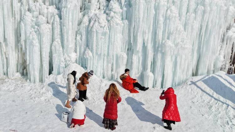 近日,沈阳市浑南区双园路的冰瀑布引众多游客前来打卡拍照。这里的冰瀑布造型独特,在蓝天的映衬下,显得格外壮美,游客们身着各色冬装,在此摆出各种姿势拍照,轻松就能拍出冰岛同款美照,随手一拍就是大片,能让游客轻松拿捏冬日氛围感。(本组图片由记者 白琳 摄)