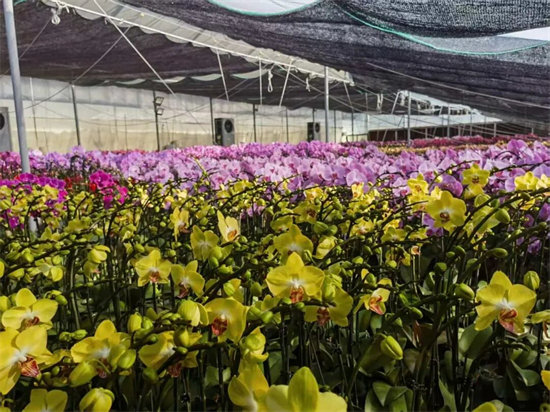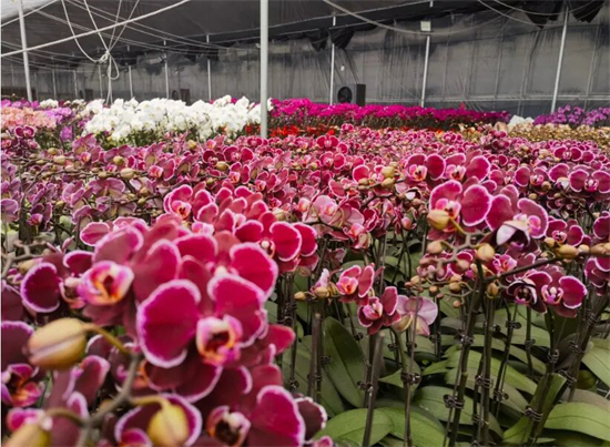 蝴蝶兰的畅销,离不开精细化的培育管理。作为娇贵花卉,其生长对温湿度、水肥等条件要求严苛。基地配套建设智能温室设施,通过智能温控系统及空调、智能水源机等设备将温度精准控制在18℃~28℃,湿度维持在60%~70%,为花卉生长提供最佳环境。从种苗培育到成品上市,每株蝴蝶兰需历经3年时间,其间基地制定科学“催花方案”与分阶段养护措施,精准防控高温高湿季节的病害风险、低温天气的冻害威胁,确保花卉能以最佳状态面市。