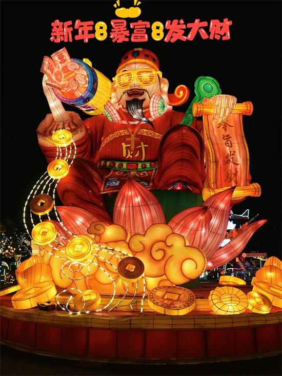 天鹅湖上,《锦映华池》悄然绽放,锦鲤灯浮光跃金,带着“鱼跃龙门”的美好祝愿,照亮一池冬夜。而万花广场上,财神爷灯组引来众多游客与之合影,沾沾新年的第一波财气!