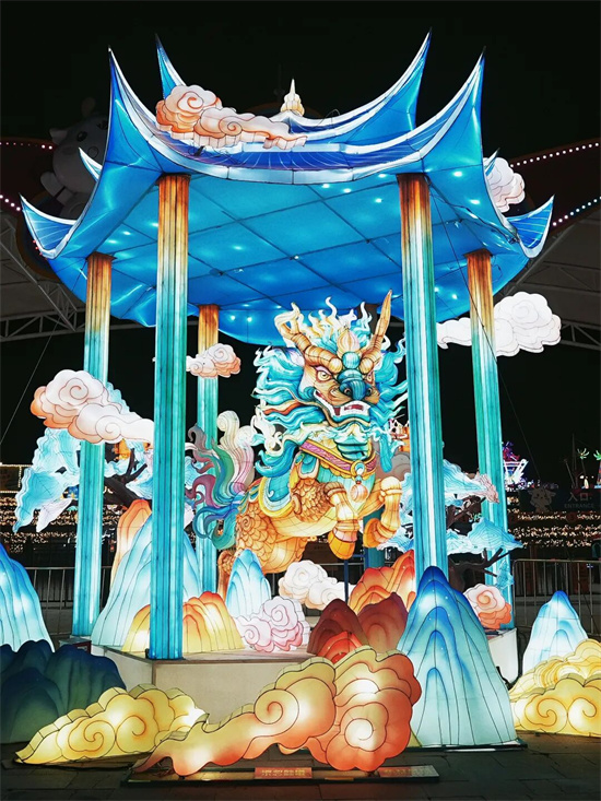 踏入山海奇幻谷,仿佛闯入一幅流动的千年画卷,十余组大型主题灯组点亮整个山谷。入口处,《麒麟纳福》灯组巍然矗立,灵动的麒麟踏着祥云,在灯笼墙的映衬下熠熠生辉,成为游客打卡的第一站。《千里江山》灯组如一卷徐徐展开的立体水墨画。鹤影掠过山峦,流水灯闪烁其间,如梦似幻。