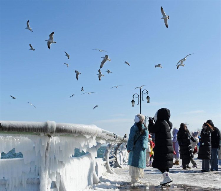2月7日,游客们在大连市东港商务区观看木栈道栏杆上悬挂的海冰冰凌。近日受持续低温影响,潮汐在大风的作用下涌向岸边,海水在护栏上凝结成晶莹剔透的海冰冰凌。(摄影:特约记者 吕文正)