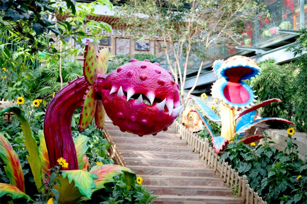 花海造景同样惊艳,近百种反季花卉勾勒出缤纷花境。蝴蝶兰打造的天空之城悬浮岛垂吊而下,梦幻十足;“花瀑”“花火焰”旁,蓝星蕨、宝莲灯等花卉相映成趣;多肉植物打造的“肉食”恐龙造型新奇可爱,成为新晋打卡点。