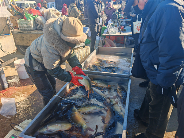 除了新鲜地道的海鲜,大集上的年味元素一应俱全。各类新鲜蔬菜、时令水果、干货杂粮、散养土鸡让人目不暇接,炸货、腌菜等即食产品香气扑鼻,红火的灯笼、喜庆的春联挂满摊位两侧,将节日氛围烘托得愈发浓厚。往来群众手提肩扛,满载着精心挑选的年货,在熙熙攘攘的人流中感受独属于皮口大集的烟火暖意与新春喜悦。