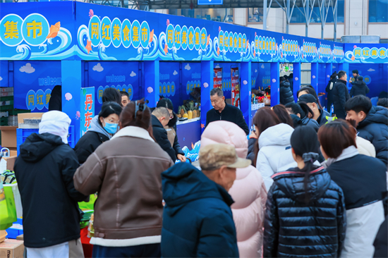 网红美食市集现场烹制香甜元宵与非遗海蛎子面,吸引市民游客争相品尝;非遗花饽饽、皮口石固花卉等特色展品与海洋主题打卡点吸引众人驻足,处处洋溢着欢乐温馨的节日气息。