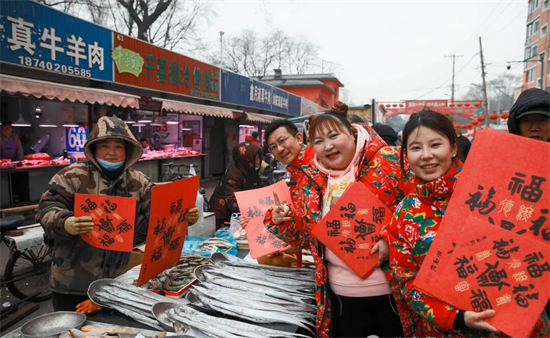 3月2日,“小胖丫”华夏走进沈阳人气地标小河沿早市进行元宵节送福,将福字送到早市摊主、市场管理人员、环卫工人以及远道而来的游客手中。
