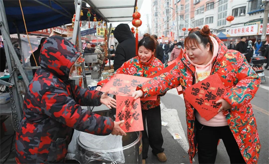 “小胖丫”华夏身穿喜庆又极具东北特色的大花袄,化身“送福使者”,穿梭在早市的摊位之间,将一幅幅饱含心意的福字送到摊主手中,“过年好!辛苦啦!送您一张福字,祝您新年生意兴隆!”亲切的问候、暖心的祝福,搭配着东北人特有的热情,让寒冷的冬日充满温情。
