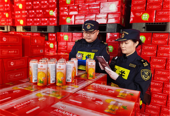 3月4日,在大连安德利果蔬汁有限公司仓库内,以大连瓦房店苹果生产的2674箱果汁整装待发。大连长兴岛海关关员仔细核对产品的货证信息、检查包装密封性、核验标签与产地溯源信息,经查验合格后,这批出口果汁顺利通关放行,随后将通过陆路运输经霍尔果斯口岸出口至乌兹别克斯坦。这是大连地区果汁类产品首次出口乌兹别克斯坦。