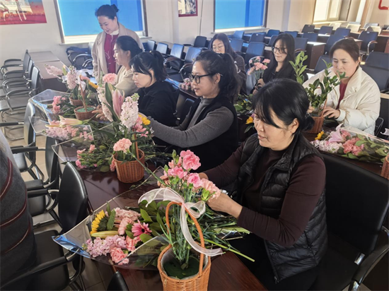 在前当堡镇“指尖繁花 绽放巾帼风采”插花活动现场,玫瑰、康乃馨、洋桔梗等花材整齐摆放,花艺老师现场指导妇女们修枝、定型、插篮。姐妹们认真聆听、巧手创作,将零散花材变成一件件清新雅致的花艺作品,现场洋溢着温馨愉悦的节日氛围。
