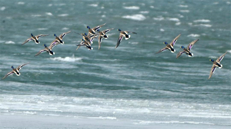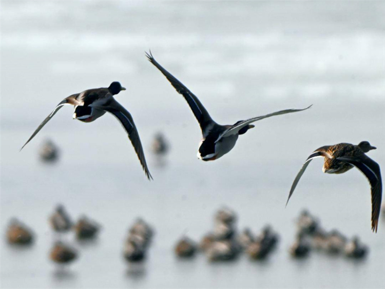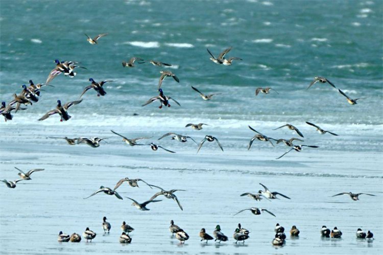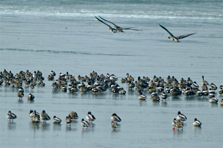 3月10日,记者在盘锦市大洼区三角洲水库的冰面边缘和水面上看到,数以万计的绿头鸭、针尾鸭等雁鸭类、鸥类等候鸟在休憩、嬉戏、觅食,不时成群起飞形成铺天盖地的鸟浪,场面十分壮观。