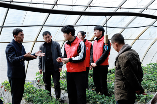 志愿服务团队参观草莓大棚,并与当地技术推广站人员共同研究增效措施 供图 辽阳县融媒体中心
