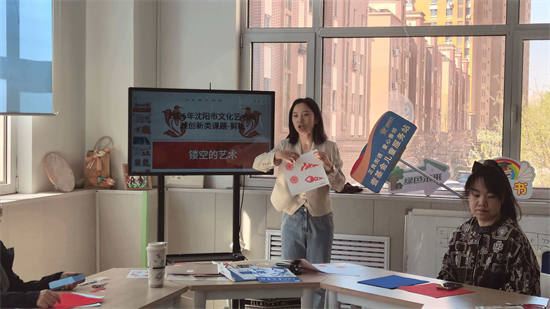 活动现场,沈阳大学教师马冠群展示了多幅经典剪纸作品,还精心设计了两个体验环节,剪红纸窗花与剪蓝色青花瓷。